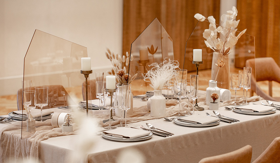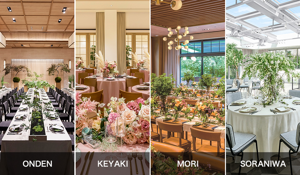 ルーフトップに立つ3面ガラス張りの会場や、和モダン、テラス付きなどテイストや人数によってお選びいただけます。バンケットは全て専用のホワイエ付き、ワンフロア貸切なのでプライベート感も抜群です。